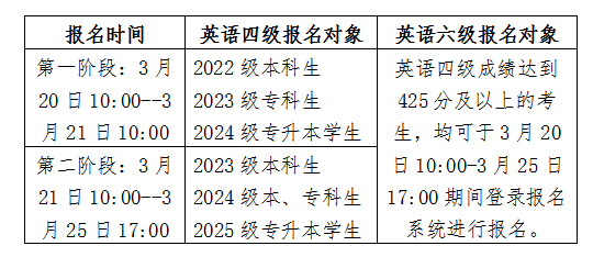 综合考量我校考场容量及本次考生规模等因素,此次英语四级考试报名将分时段进行,六级考试报名不受时段限制,具体安排详见下表。请各位考生务必在对应时段内尽早完成报名,避免因后期考场容量饱和错失报考资格。若报名过程中遇系统拥堵等问题,请耐心等待并多次尝试,直至完成报名操作。